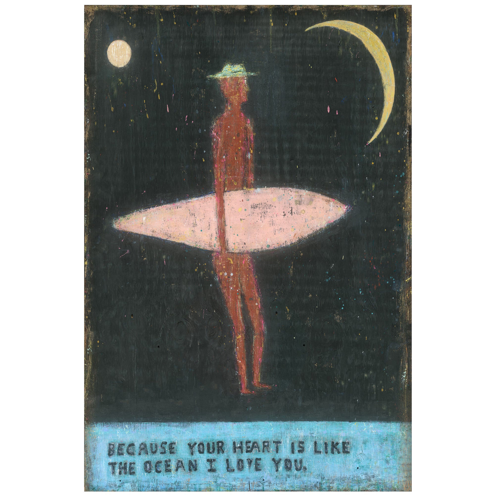 Dive into the dreamy and poetic world of the Because Your Heart Is Like The Ocean art print. Featuring a captivating silhouette of a surfer under the moon and stars, this piece speaks to the boundless depth and beauty of the heart. The textured, hand-crafted feel and whimsical charm of the print make it a striking statement for any room. Perfect for ocean lovers, free spirits, or anyone who feels a deep connection to love and nature, it’s a daily reminder of the vastness within us all. Frame it, gift it, or let it inspire your own creative tides.