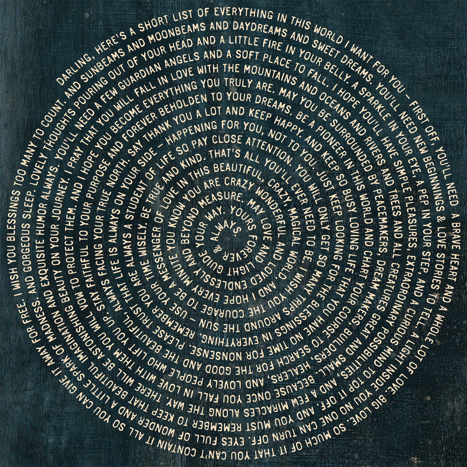 "Darling, Here's a short list of everything in this world I want for you – First off, you'll need a brave heart and a whole lot of love. BIG LOVE. So much of it that you can't contain it all so you can give it away for free. I wish you blessings too many to count. And sunbeams and moonbeams and daydreams and sweet dreams. You'll need new beginnings & love stories to tell. A light inside you no one can turn off. Eyes full of wonder and a little spark of madness. And gorgeous sleep. Lovely thoughts pouring out of your head and a little fire in your belly. A sparkle in your eye, a pep in your step, and a curious mind to top it off. And you must remember to keep that beautiful imagination and exquisite humor always. You'll need a few guardian angels and a soft place to fall. I hope you'll have simple pleasures, extraordinary possibilities, and a few miracles along the way. There will be astonishing beauty on your journey. I pray that you will fall in love with the mountains and oceans and rivers and trees and all creatures great and small. Because once you fall in love with them you will vow to protect them. And I hope you become everything you truly are. May you be surrounded by peacemakers, dream makers, builders, healers, and lovely people who lift you up. Stay faithful to your purpose and forever beholden to your dreams. Be a pioneer in this world and chart your course to search for the good and the beautiful, always facing your True North. Say thank you a lot and keep happy. And keep so busy loving life that you have no time for nonsense. Please trust that life is always on your side – happening for you, not to you. Just keep looking for the blessings in everything. Remember you are always a student of life so pay close attention. You will only get so many trips around the sun – use your time wisely. Be true and kind. That's all you'll ever need to be. I wish you the courage to be a messenger of love in this beautiful, crazy, magical world. And I hope every minute you know you are crazy wonderful and loved endlessly and beyond measure. May love and light guide your way. Yours forever & always."